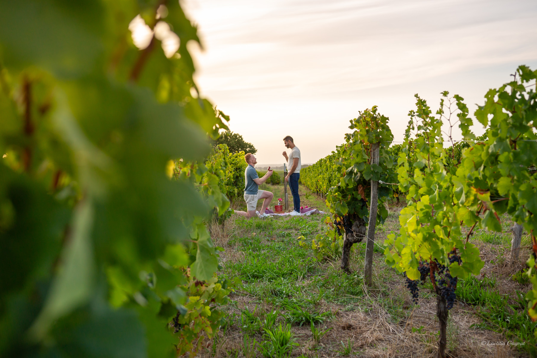 Caché dans les vignes, j’ai eu le privilège de capturer l’instant magique où Matt, le cœur battant, s’est agenouillé devant Facundo pour lui demander sa main. Un geste simple, mais empli d’un amour immense, qui a illuminé leurs regards.